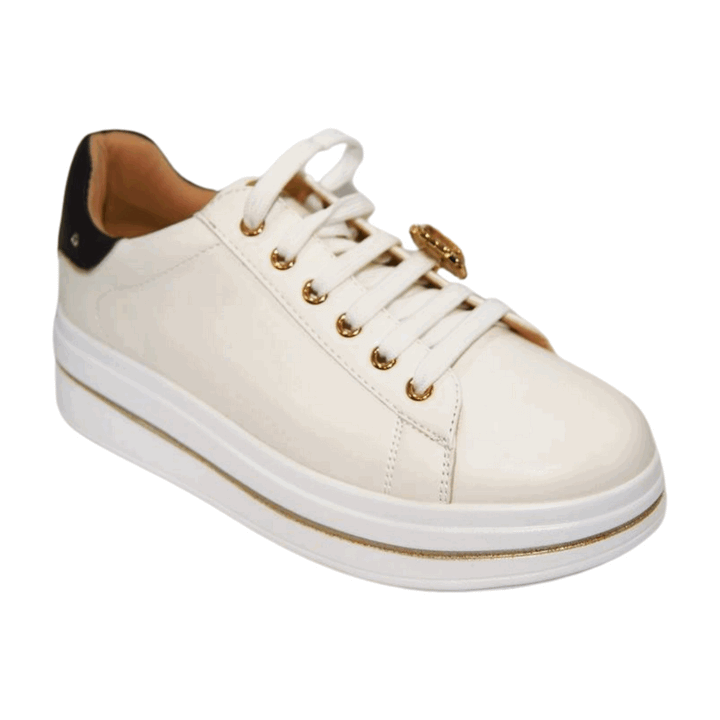 Sneakers donna platform Valleverde in similpelle bianca con riporto nero sulla talloniera. Tomaia interna e plantare removibile in pelle. Chiusura con lacci piatti in cotone in tinta con maxi applicazione gioiello passalacci removibile. Fondo gomma a contrasto altezza 4.5 cm