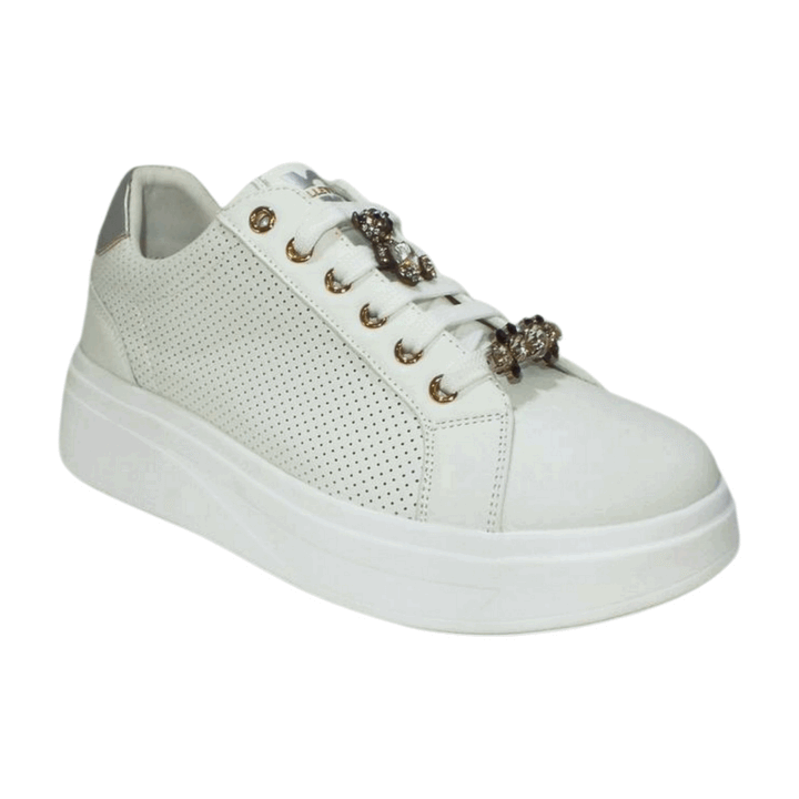 Sneakers donna platform Valleverde in similpelle laserata bianca con riporto lamé silver. Tomaia interna e plantare removibile in pelle. Chiusura con lacci piatti in cotone in tinta con accessori gioiello passalacci. Fondo gomma altezza 4.5 cm