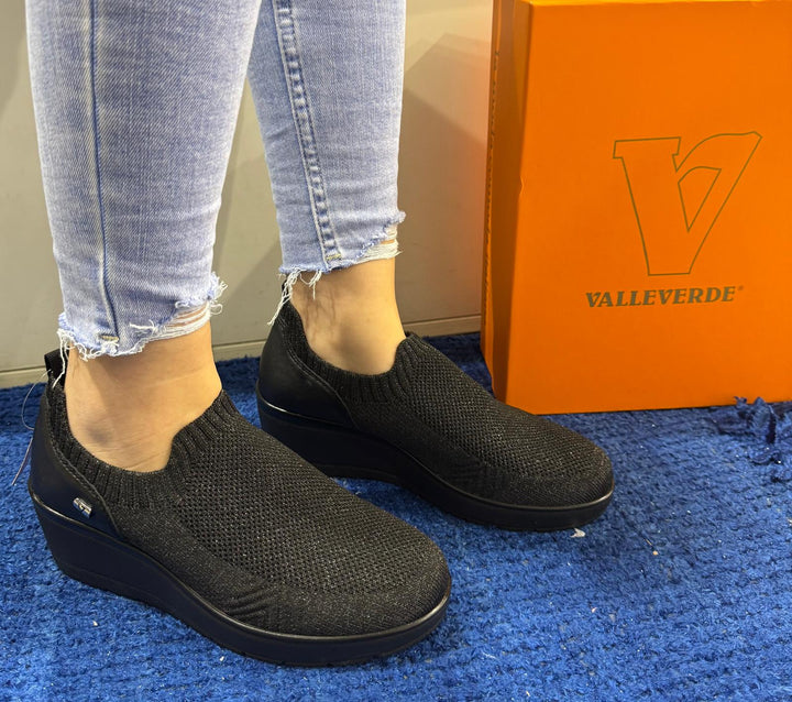 Sneakers donna slip-on Valleverde in tessuto elastico lurex nero e inserti in pelle in tinta. Tomaia interna e plantare removibile in pelle, calza facile posteriore. Fondo gomma zeppa altezza 6 cm.