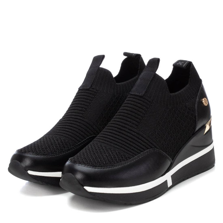 Sneakers slip-on donna xti in tessuto elastico mesh nero e dettagli oro. Calza facile posteriore logato e anteriore. Inserti in ecopelle in tinta, plantare removibile in memory foam. Fondo zeppa bicolor altezza 6 cm.