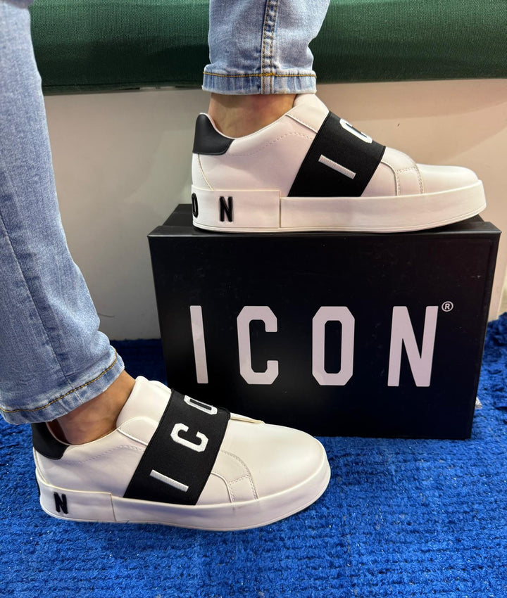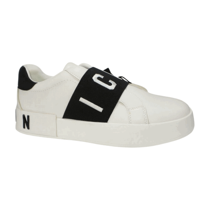 Sneakers slip-on Icon in ecopelle bianca con fascione elastico a contrasto nero con logo ricamato. Riporto talloniera in ecopelle nero, fondo gomma logato altezza 4 cm.