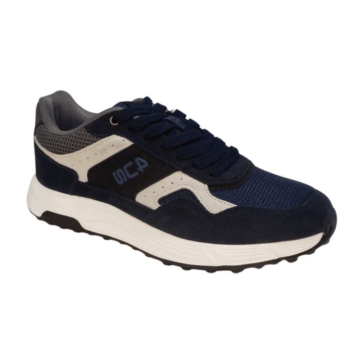 Sneakers uomo 4US by Cesare Paciotti in pelle e camoscio blu e grigio con inserti in mesh e dettagli a contrasto. Linguetta e talloniera logate. Sottopiede in pelle comfort foam, chiusura con lacci piatti in cotone. Fondo in gomma logato altezza circa 4 cm.