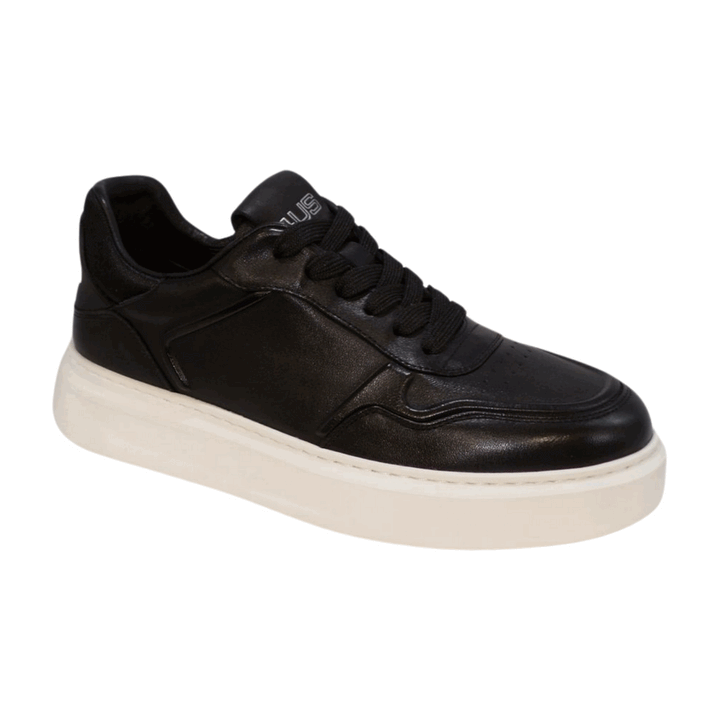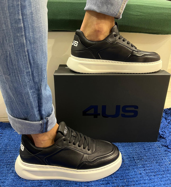 Sneakers uomo 4US by Cesare Paciotti in pelle total black. Logo a contrasto sulla talloniera e sulla linguetta. Sottopiede in pelle comfort foam, chiusura con lacci piatti in cotone in tinta. Fondo bold altezza 4.5 cm