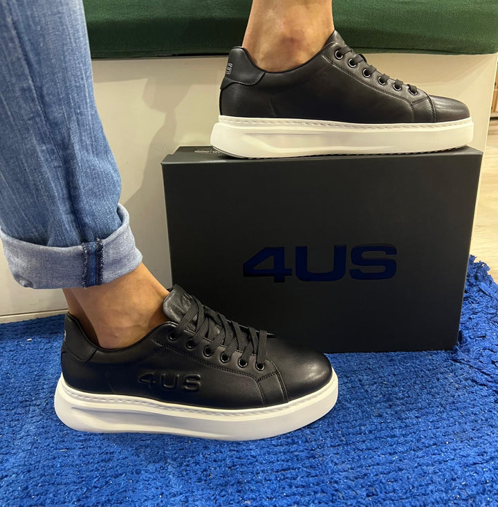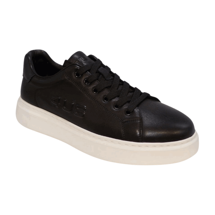 Sneakers uomo 4US by Cesare Paciotti in pelle total black. Logo laterale a rilievo e sulla linguetta. Sottopiede in pelle comfort foam, chiusura con lacci piatti in cotone in tinta. Fondo bold altezza 4.5 cm