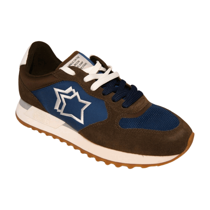 Sneakers uomo Atlantic Stars in suede e nylon tecnici marrone e blu, con guancialino in vitello. Chiusura con lacci piatti in cotone in due varianti colore. Sottopiede estraibile, logo ricamato sul laterale. Suola in EVA fresata, fondo gomma con battistrada dentellato altezza 3.5 cm