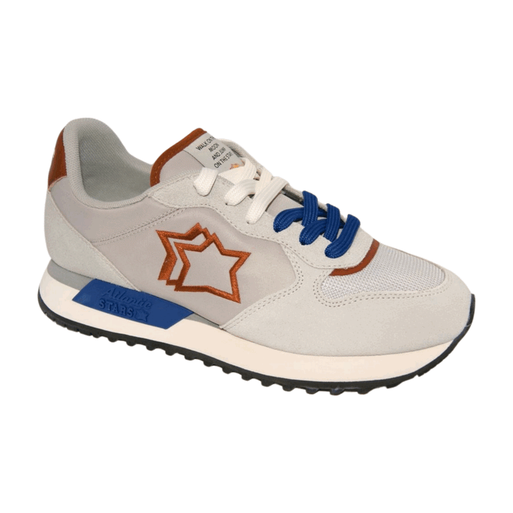Sneakers uomo Atlantic Stars in suede e nylon tecnici con guancialino in vitello a contrasto. Chiusura con lacci piatti in cotone in due varianti colore. Sottopiede estraibile, logo ricamato sul laterale. Suola in EVA fresata, fondo gomma con battistrada dentellato altezza 3.5 cm