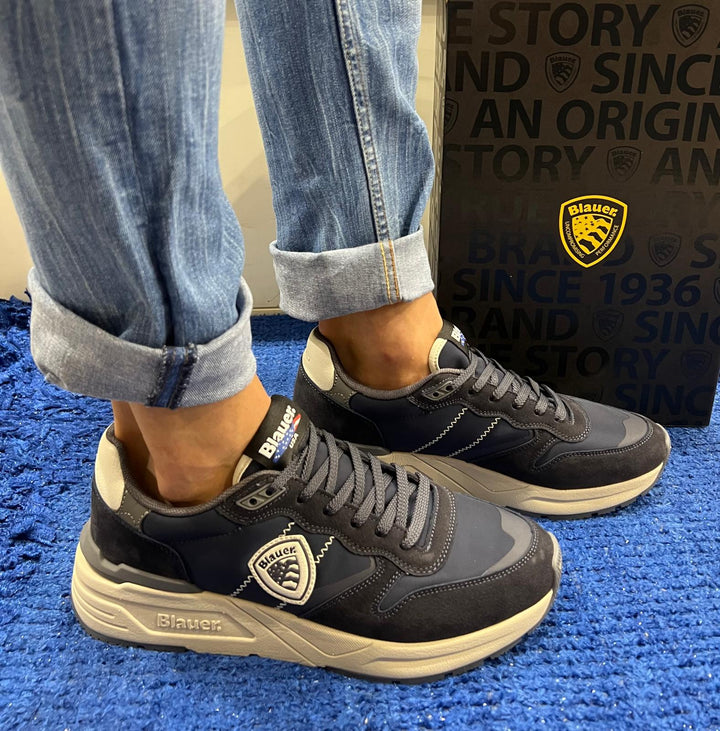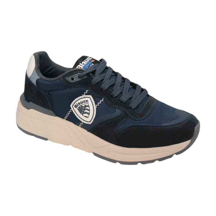 Sneakers uomo Blauer in ecopelle, eco camoscio e tessuto tecnico blu navy con inserto spoiler posteriore gommato grigio. Chiusura con lacci piatti in cotone in tinta, linguetta logata e patch logo laterale. Sottopiede morbido estraibile, fondo in gomma logato altezza 4.5 cm