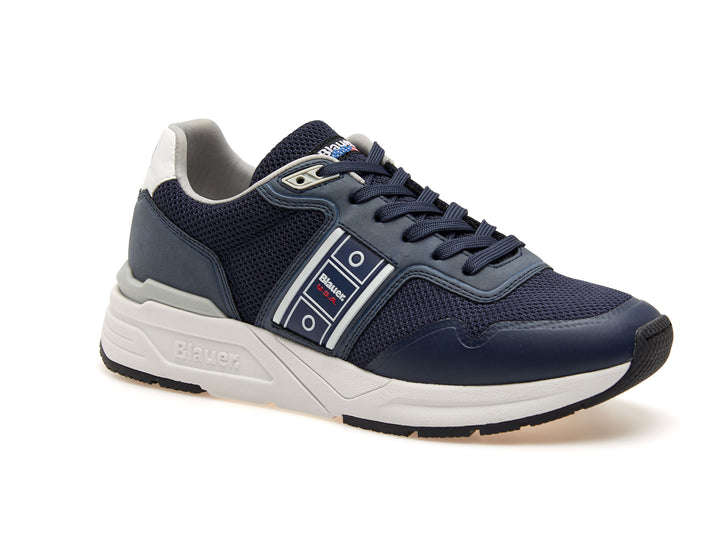 Sneakers uomo Blauer in tessuto mesh e pelle blu navy con dettagli bianchi. Talloniera rinforzata, linguetta logata e patch logo gommata. Chiusura con lacci piatti in cotone in tinta, sottopiede morbido. Spoiler posteriore gommato, fondo gomma logata a contrasto altezza 4cm.