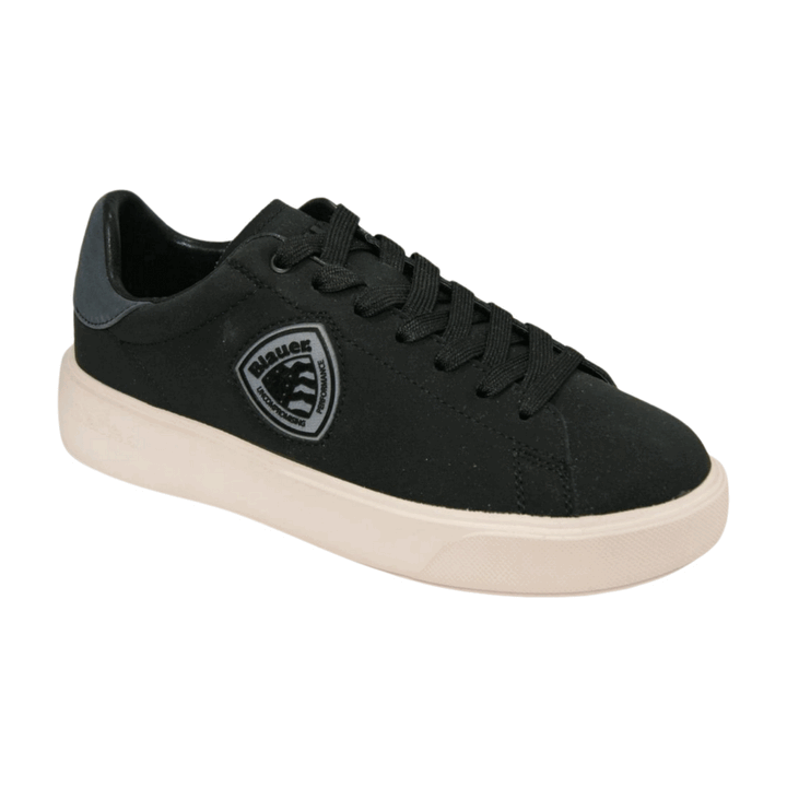 Sneakers uomo Blauer in pelle total black. Chiusura con lacci piatti in cotone in tinta, linguetta logata. Patch logo laterale, sottopiede estraibile. Fondo in gomma logato altezza 4 cm.