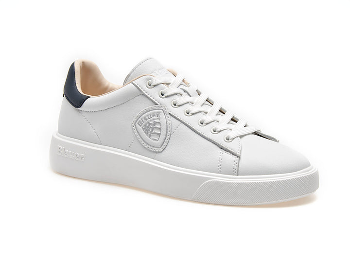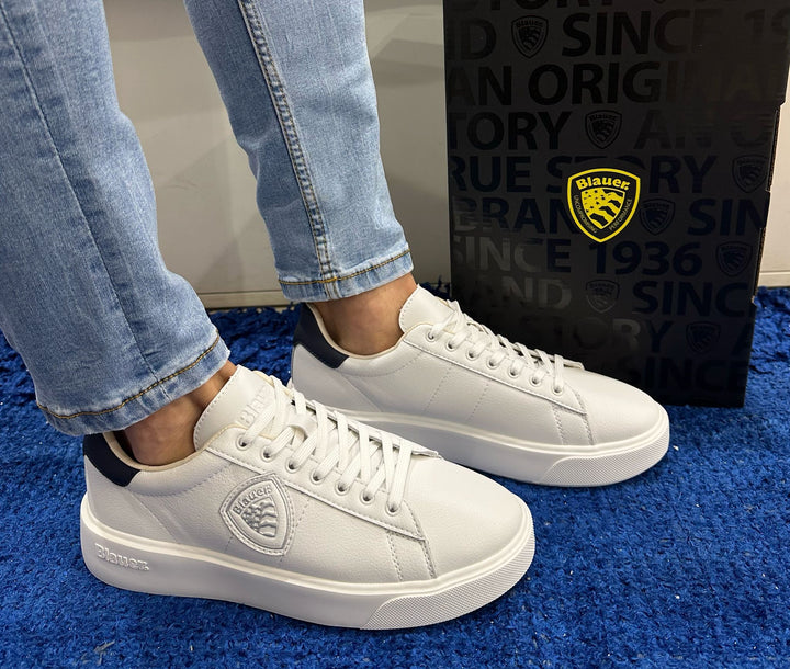 Sneakers uomo Blauer in pelle bianca con talloniera a contrasto blu navy. Linguetta logata, patch logo laterale. Chiusura con lacci piatti in cotone in tinta, sottopiede in memory foam. Fondo gomma logata altezza 3.5 cm