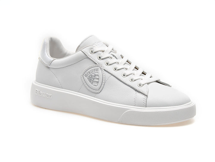 Sneakers uomo Blauer in pelle bianca. Linguetta logata, patch logo laterale. Chiusura con lacci piatti in cotone in tinta, sottopiede in memory foam. Fondo gomma logata altezza 3.5 cm