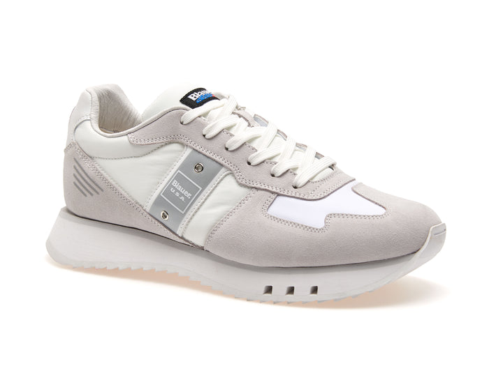 Sneakers uomo Blauer in tessuto e camoscio bianca. Talloniera rinforzata, linguetta logata e patch logo laterale. Chiusura con lacci piatti in cotone in tinta, sottopiede in memory foam. Fondo gomma altezza 3.5 cm