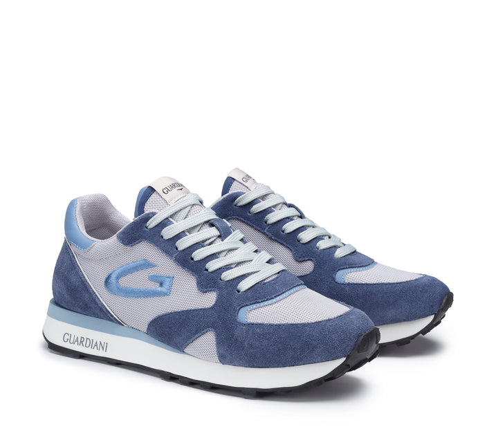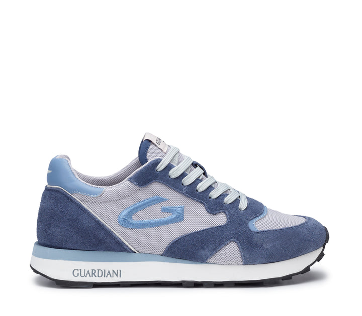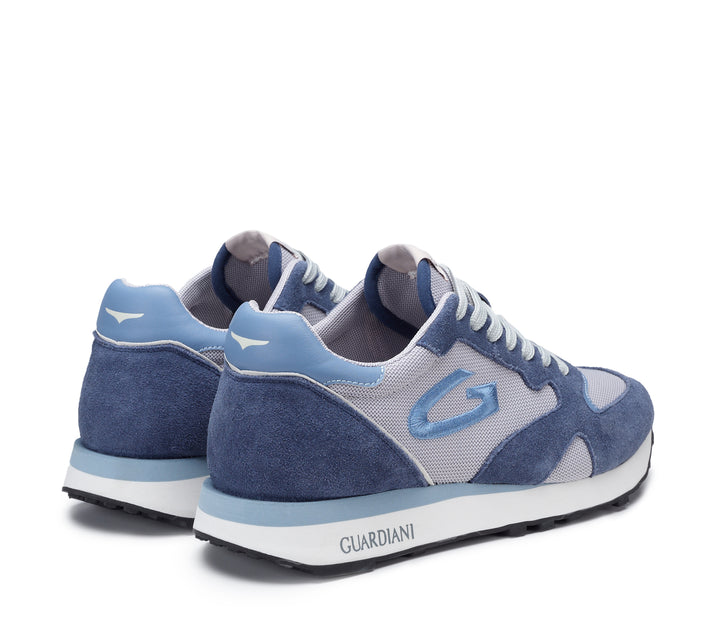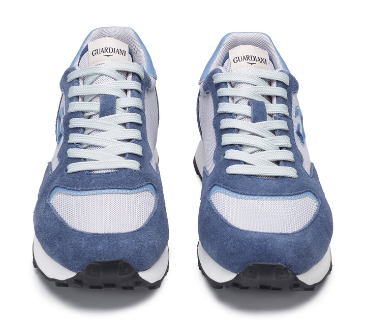 Sneakers uomo Guardiani in camoscio blu e mesh grigio. Tomaia interna e plantare removibile in pelle, logo laterale. Chiusura con lacci piatti in cotone, fondo gomma logata bicolor altezza 3.5 cm