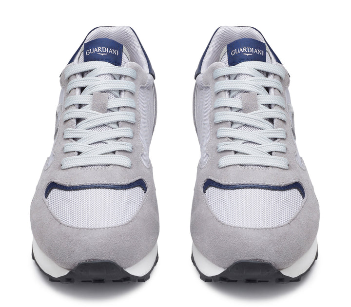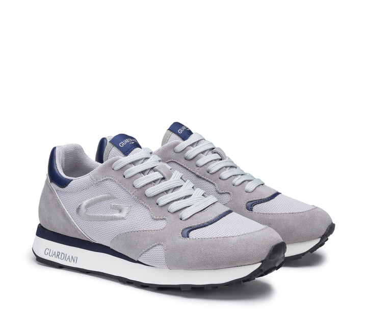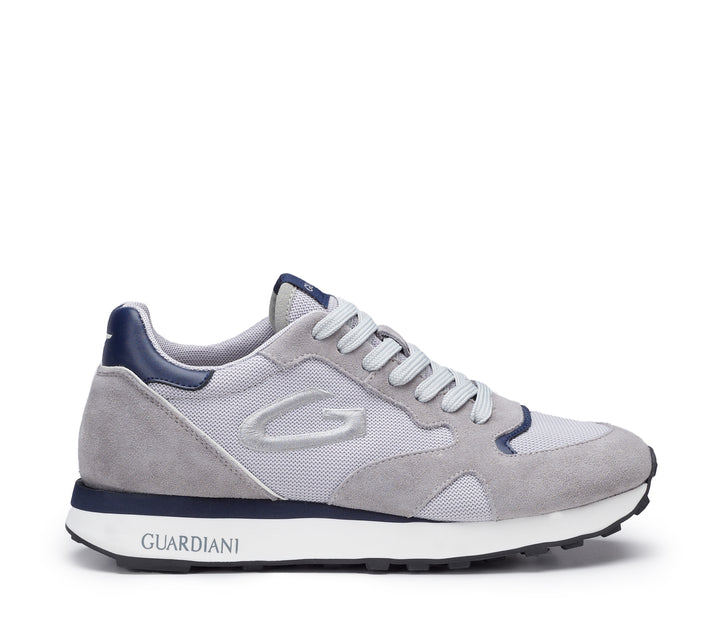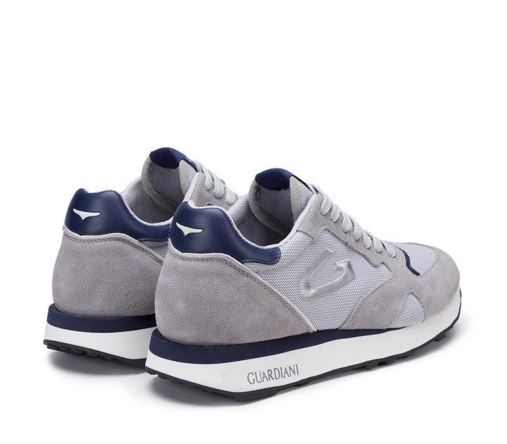 Sneakers uomo guardiani in camoscio grigio e mesh grigio chiaro, con riporti in pelle blu. Tomaia interna e plantare removibile in pelle, logo laterale a contrasto. Chiusura con lacci piatti in cotone, fondo gomma logata bicolor altezza 3.5 cm