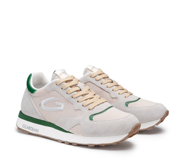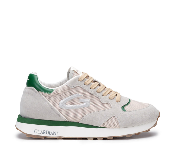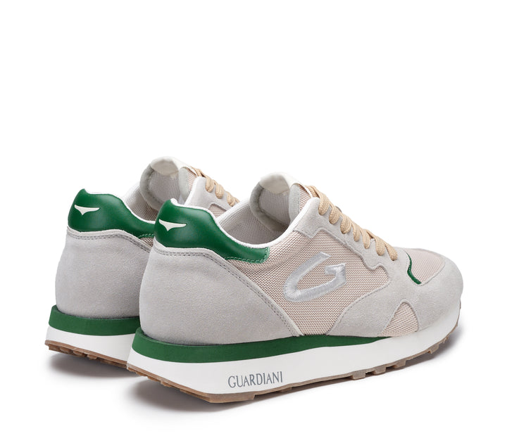 Sneakers uomo Guardiani in camoscio grigio e mesh bianco sporco, con riporti in pelle verdi. Tomaia interna e plantare removibile in pelle, logo laterale a contrasto. Chiusura con lacci piatti in cotone, fondo gomma logata bicolor altezza 3.5 cm