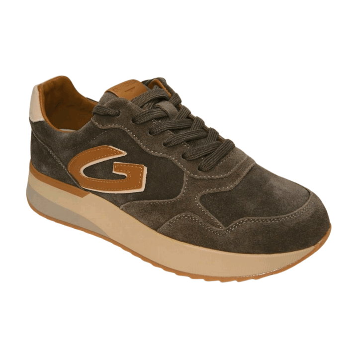 Sneakers uomo Guardiani in camoscio grigio con inserti color tabacco. Mini logo a contrasto sulla talloniera e logo cucito sul laterale. Chiusura con lacci piatti in cotone in tinta, sottopiede in pelle. Fondo in gomma bicolor altezza 4.5 cm