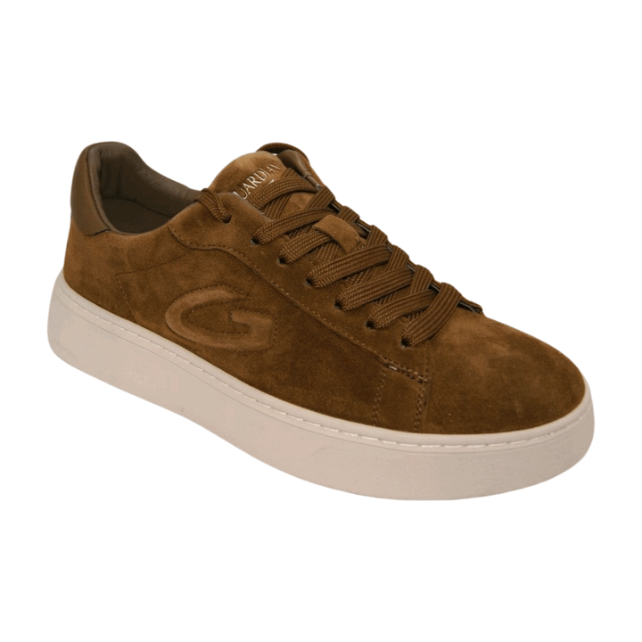 Sneakers uomo Guardiani in camoscio color cioccolato con mini logo a contrasto sulla talloniera. Chiusura con lacci piatti in cotone in tinta, maxi logo a rilievo laterale. Sottopiede in pelle, fondo in gomma logato altezza 4 cm.