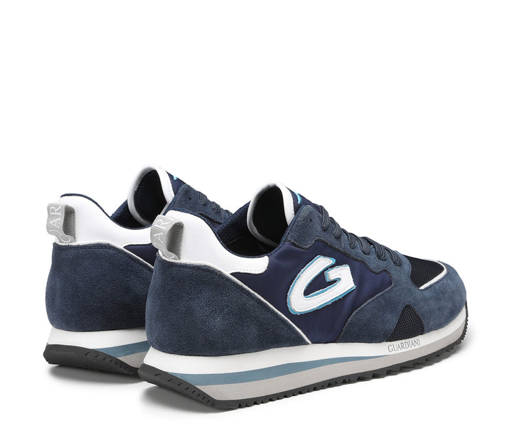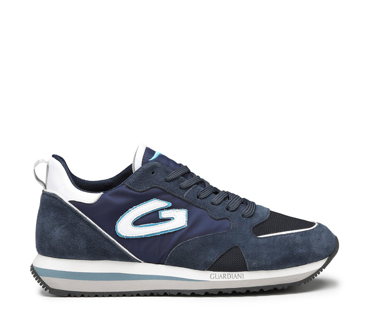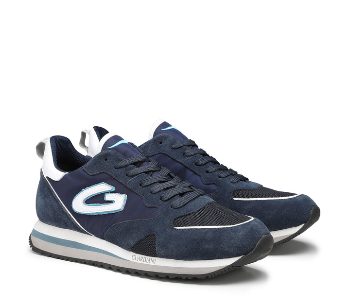 Sneakers uomo Guardiani in camoscio e mesh blu scuro, con riporti in tessuto tecnico bluette e in pelle bianca. Tomaia interna e plantare removibile in pelle, logo laterale a contrasto. Chiusura con lacci piatti in cotone, fondo gomma logata bicolor altezza 3.5 cm