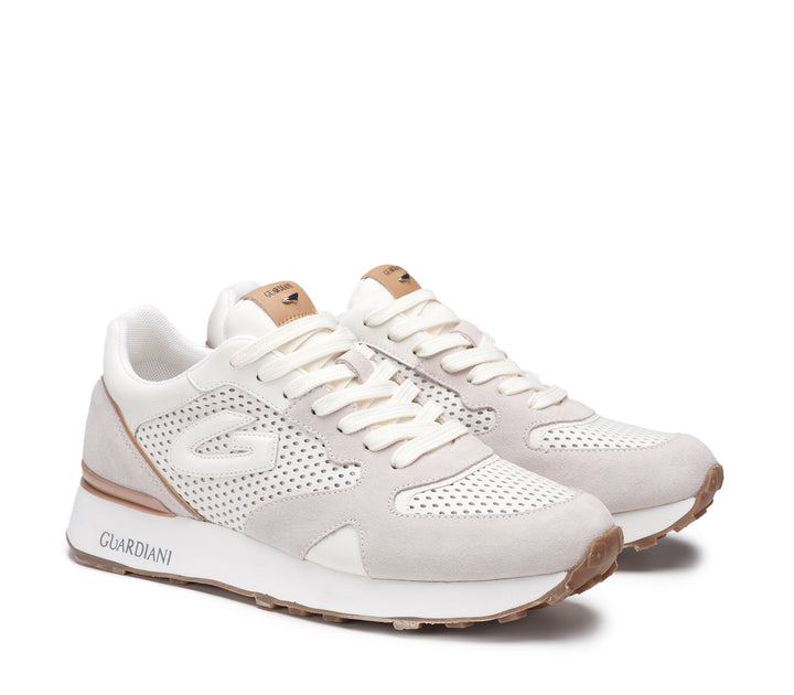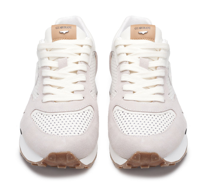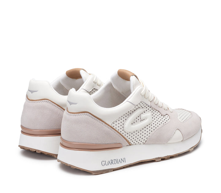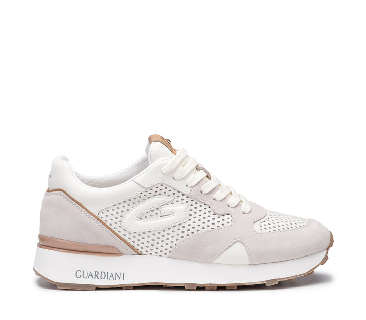 Sneakers uomo Guardiani in pelle laserata e camoscio bianco sporco con dettagli beige. Tomaia interna e plantare removibile in pelle, logo laterale in rilievo e spoiler posteriore. Chiusura con lacci piatti in cotone, fondo gomma logata altezza 3.5 cm
