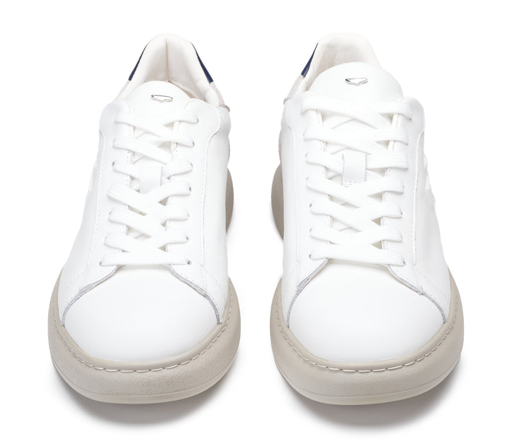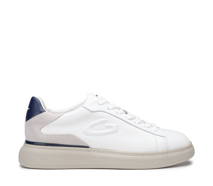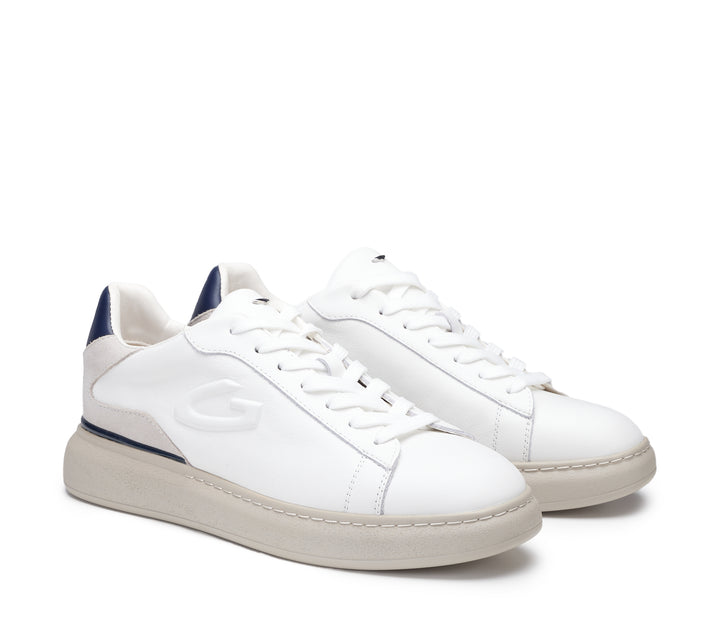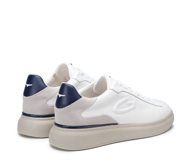 Sneakers uomo Guardiani in pelle e camoscio bianca con riporto posteriore blu, tomaia interna e plantare removibile in pelle. Logo laterale in rilievo, chiusura con lacci piatti in cotone in tinta. Fondo bold logato altezza 3 cm.