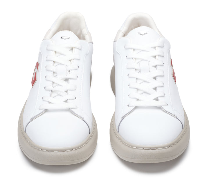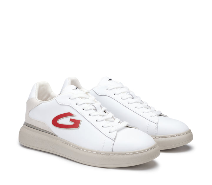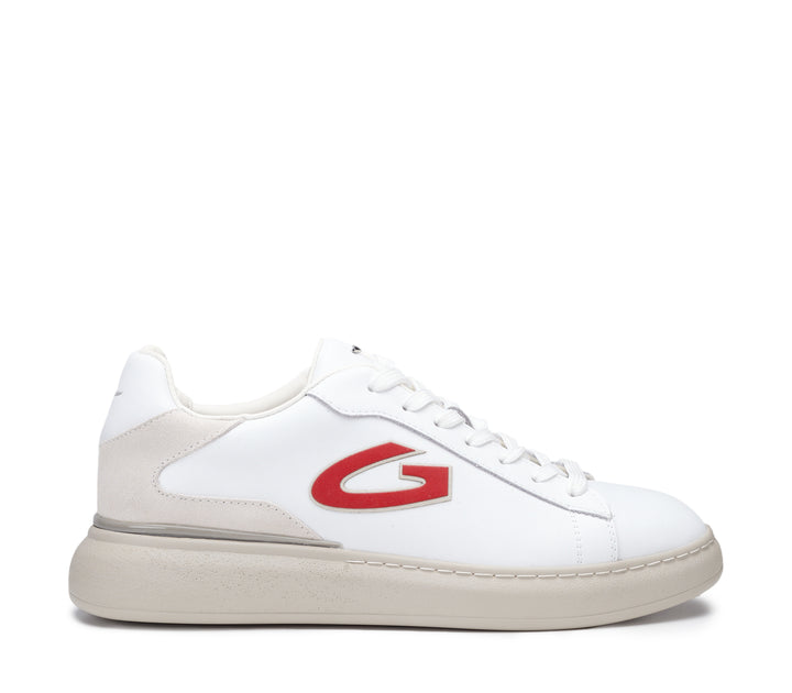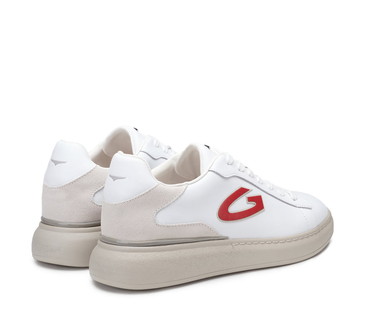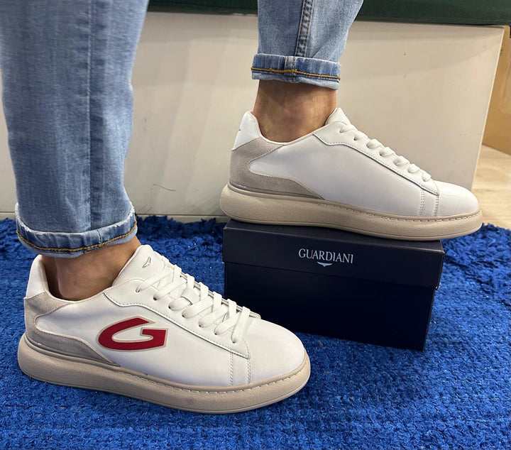 Sneakers uomo Guardiani in pelle e camoscio bianca, tomaia interna e plantare removibile in pelle. Logo laterale in rilievo a contrasto rosso, chiusura con lacci piatti in cotone in tinta. Fondo bold logato altezza 3 cm.