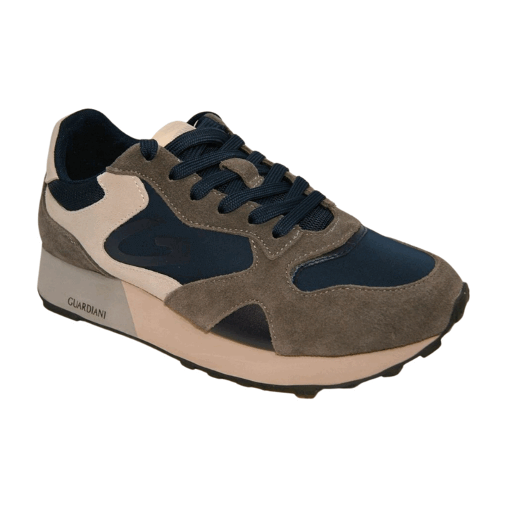 Sneakers uomo Guardiani in pelle scamosciata grigia e tessuto tecnico e mesh blu. Mini logo a contrasto sulla talloniera e stampa logo in tinta sul laterale. Chiusura con lacci piatti in cotone in tinta, sottopiede in pelle. Fondo in gomma bicolor logato altezza 3.5 cm