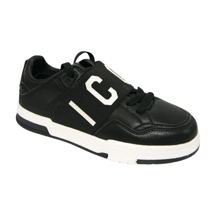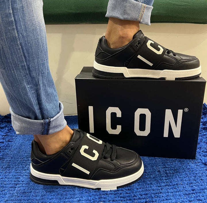 Sneakers uomo Icon in ecopelle nera con dettagli bianchi a contrasto. Chiusura con lacci piatti in cotone in tinta e maxi elastico copri lacci con logo. Sottopiede comfort foam, fondo in gomma altezza 3.5 cm