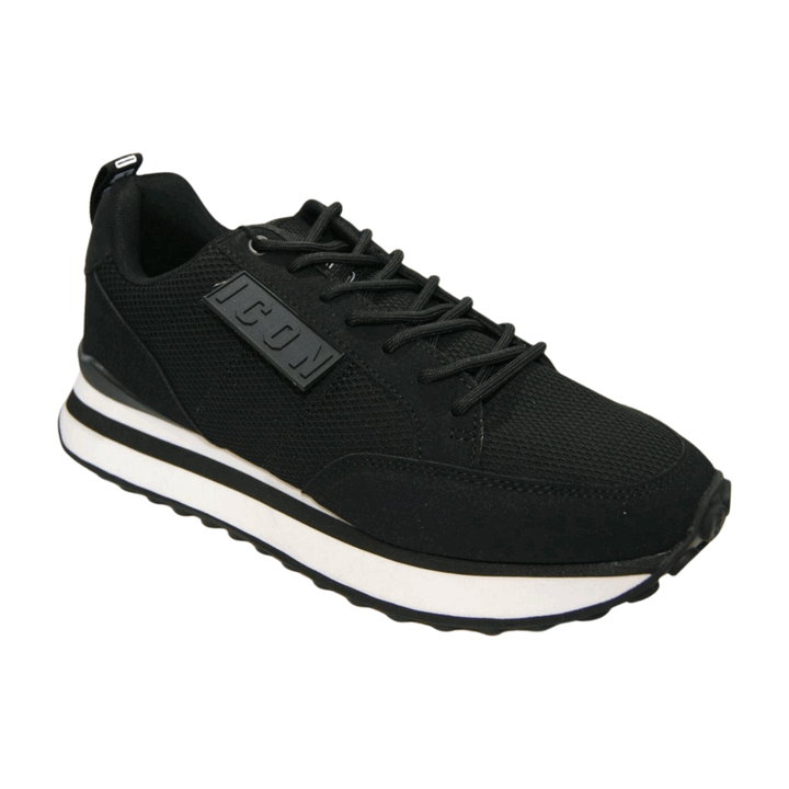 Sneakers uomo Icon in tessuto e mesh total black con inserti logo a contrasto su linguetta e talloniera. Chiusura con lacci tondi in cotone in tinta e targhetta gommata logo sul laterale.. Sottopiede comfort foam, fondo in gomma bicolor altezza 3.5 cm