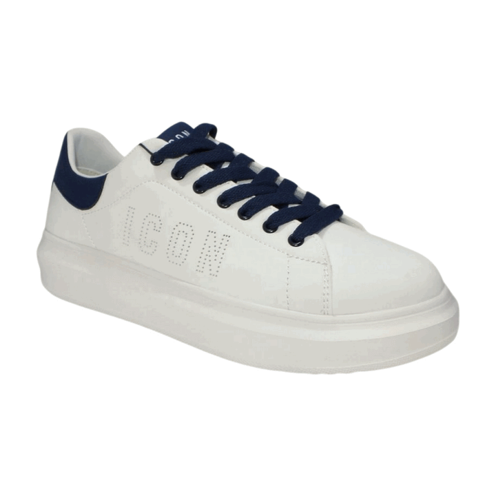 Sneakers Icon in ecopelle bianca con logo laserato laterale e linguetta logata a contrasto blu. Chiusura con lacci piatti in cotone a contrasto e riporto talloniera blu. Fondo gomma altezza 4.5 cm