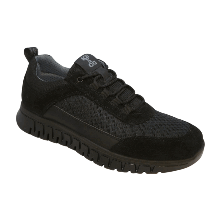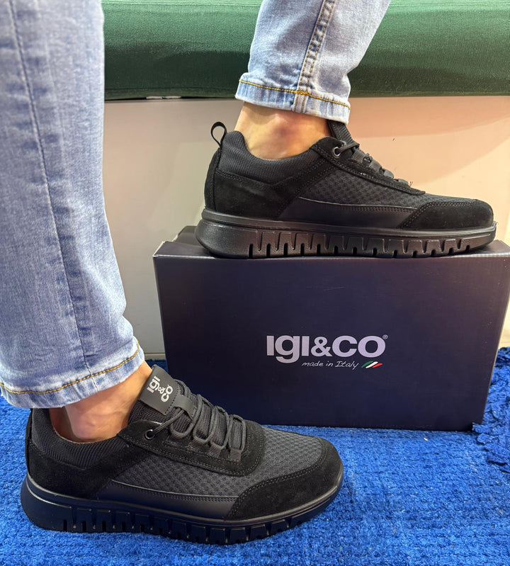 Sneakers uomo igi&co in camoscio e mesh total black. Plantare removibile in pelle in memory foam. Chiusura con lacci tondi in cotone, linguetta logata e calza facile posteriore. Fondo in gomma altezza 4 cm.