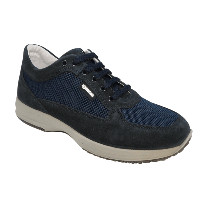 Sneakers uomo igi&co in camoscio e mesh blu scuro. Tomaia interna e plantare removibile in pelle. Chiusura con lacci piatti in cotone e linguetta logata. Fondo in gomma leggero altezza 3.5 cm