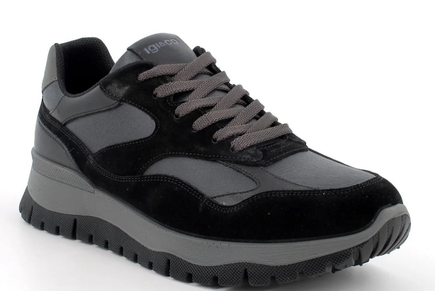 Sneakers uomo Igi&co in camoscio e tessuto total black. Chiusura con lacci in cotone in tinta, linguetta logata. Sottopiede in pelle memory foam. Fondo in gomma con battistrada dentellato altezza 4.5 cm