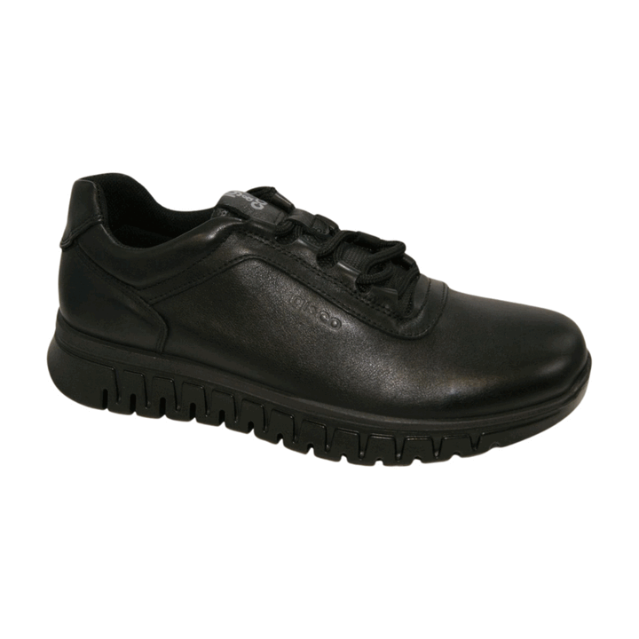 Sneakers uomo Igi&co in pelle total black. Chiusura con lacci in cotone in tinta, linguetta logata. Sottopiede in pelle memory foam. Fondo in gomma con battistrada dentellato altezza 4 cm.