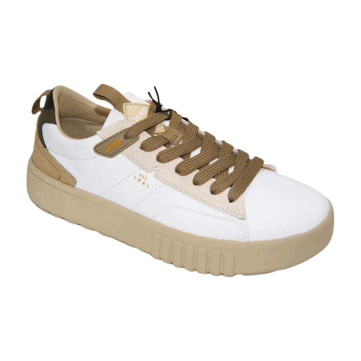 Sneakers uomo Jeep in ecopelle bianca con dettagli in eco camoscio verde e beige. Chiusura con lacci piatti in cotone a contrasto, sottopiede estraibile in memory foam. Fondo in gomma ammortizzato altezza 3.5 cm