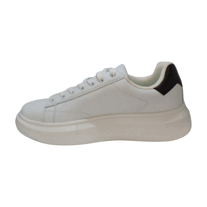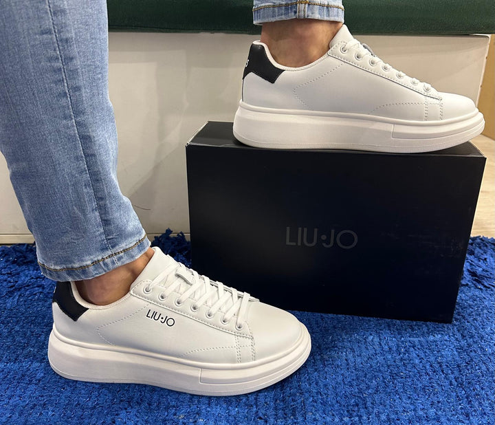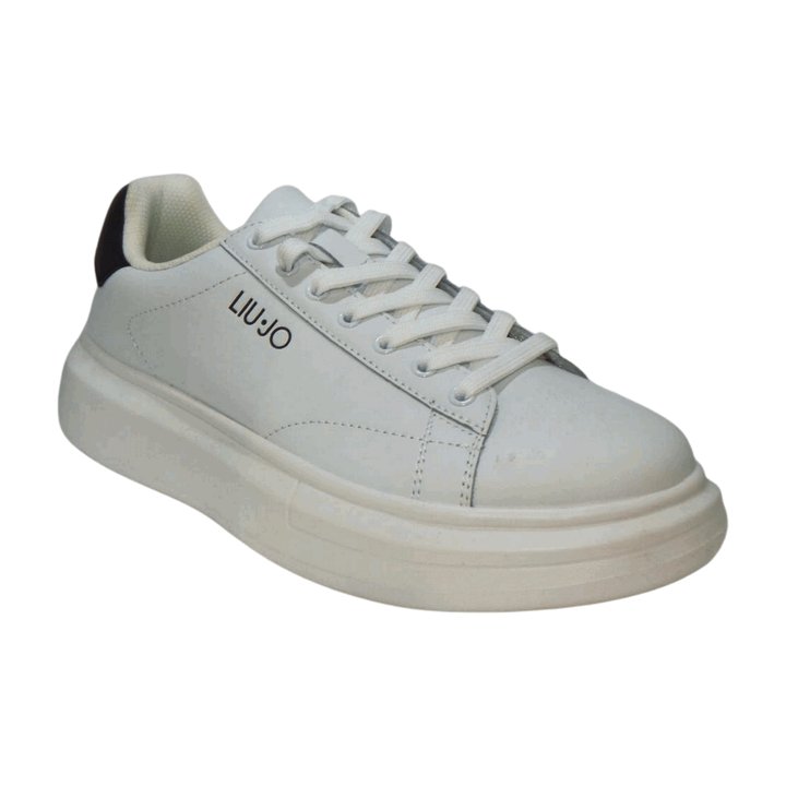 Sneakers Liu Jo in pelle bianca con logo brand laterale e riporto nero sulla talloniera. Chiusura con lacci piatti in cotone in tinta, fondo gomma altezza 4.5 cm