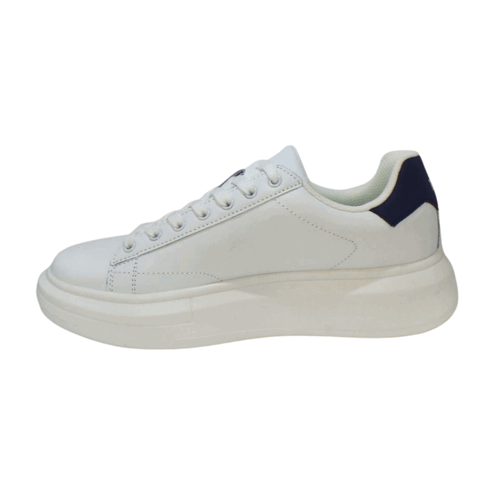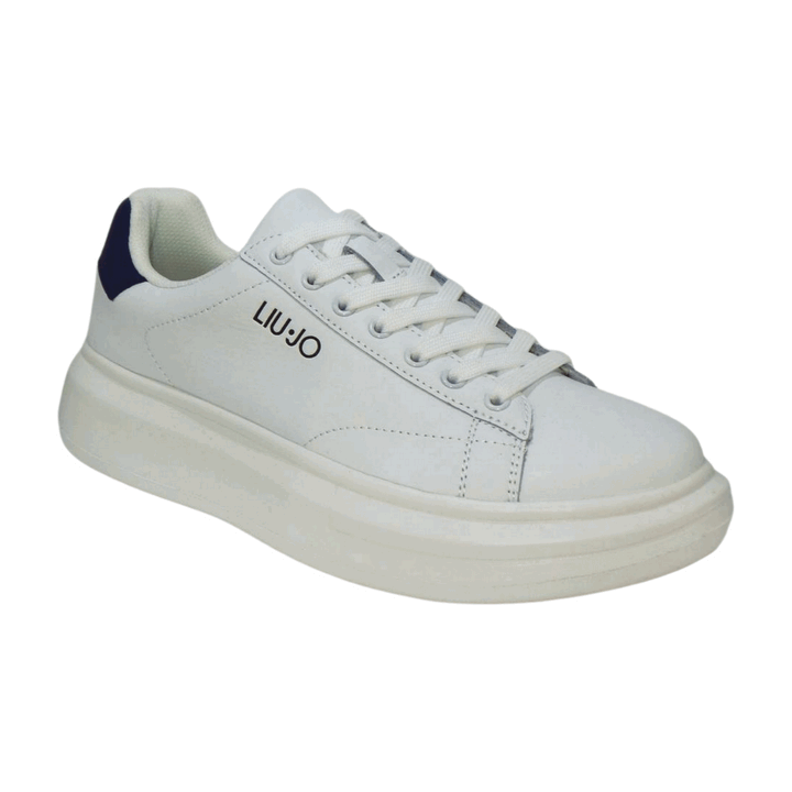 Sneakers Liu Jo in pelle bianca con logo brand laterale e riporto blu sulla talloniera. Chiusura con lacci piatti in cotone in tinta, fondo gomma altezza 4.5 cm