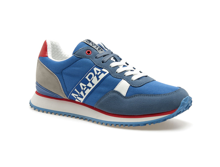Sneakers uomo Napapijri in tessuto bluette con inserti bianchi, rossi e grigi. Patch logo laterale, talloniera e linguetta logate. Chiusura con lacci piatti in cotone in tinta, sottopiede morbido. Spoiler posteriore logato, fondo gomma altezza 2.5 cm
