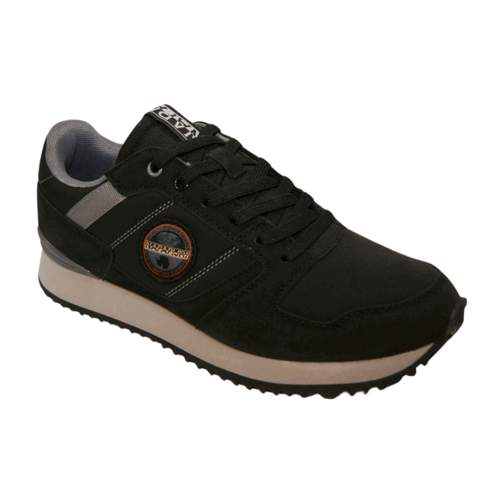 Sneakers uomo Napapijri in eco camoscio e tessuto nero con dettagli grigi. Chiusura con lacci piatti in cotone in due varianti colore, patch logo laterale e linguetta logata. Sottopiede estraibile, inserto spoiler posteriore logato. Suola in EVA fresata, fondo gomma con battistrada dentellato altezza 3 cm.
