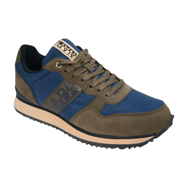 Sneakers uomo Napapijri in eco camoscio grigio e tessuto blu navy. Chiusura con lacci piatti in cotone in due varianti colore, patch logo laterale e linguetta logata. Sottopiede estraibile, inserto spoiler posteriore logato. Suola in EVA fresata, fondo gomma con battistrada dentellato altezza 3.5 cm