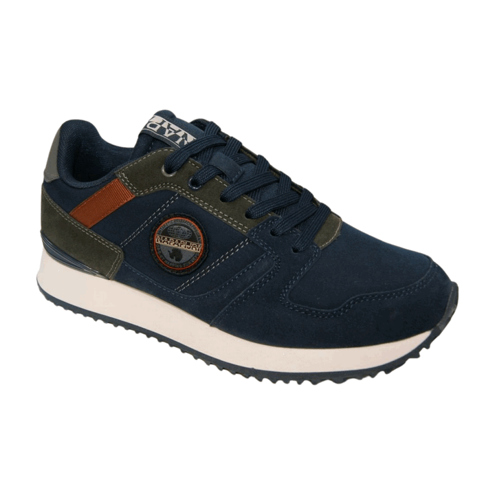 Sneakers uomo Napapijri in eco camoscio e tessuto grigio e blu con dettagli arancioni. Chiusura con lacci piatti in cotone in due varianti colore, patch logo laterale e linguetta logata. Sottopiede estraibile, inserto spoiler posteriore logato. Suola in EVA fresata, fondo gomma con battistrada dentellato altezza 3 cm.