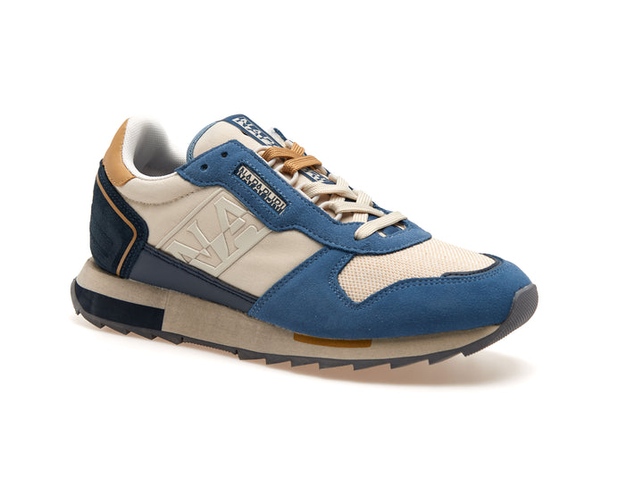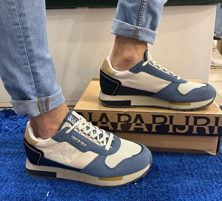 Sneakers uomo Napapijri in tessuto e mesh bianco latte con inserti in camoscio bluette e senape. Patch logo laterale, talloniera e linguetta a contrasto logate. Chiusura con lacci piatti in cotone in tinta, sottopiede morbido. Talloniera rinforzata, fondo gomma bicolor altezza 3 cm.
