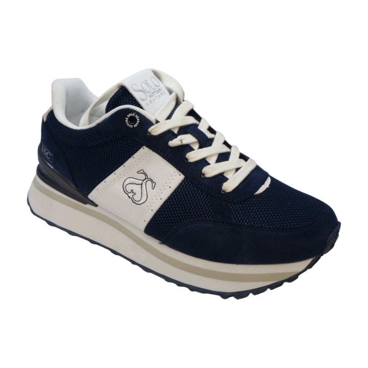 Sneakers uomo Solo Soprani Couture in mesh blu navy e inserti in ecopelle scamosciata in tinta. Dettagli bianchi, patch logo laterale e chiusura con lacci piatti in cotone. Linguetta e talloniera logate, spoiler posteriore gommato in tinta. Sottopiede in comfort foam, fondo gomma altezza 4 cm.
