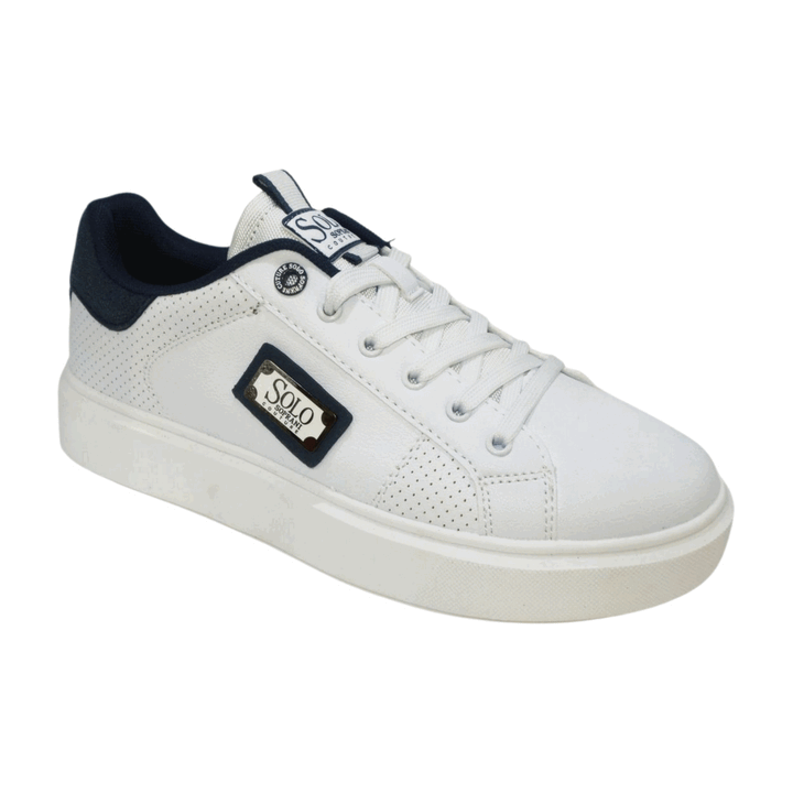 Sneakers uomo Solo Soprani Couture in ecopelle bianca con dettagli blu navy. Linguetta logata, placchetta logo laterale, talloniera con logo ricamato. Chiusura con lacci piatti in cotone in tinta, sottopiede in comfort foam. Fondo gomma altezza 3.5 cm