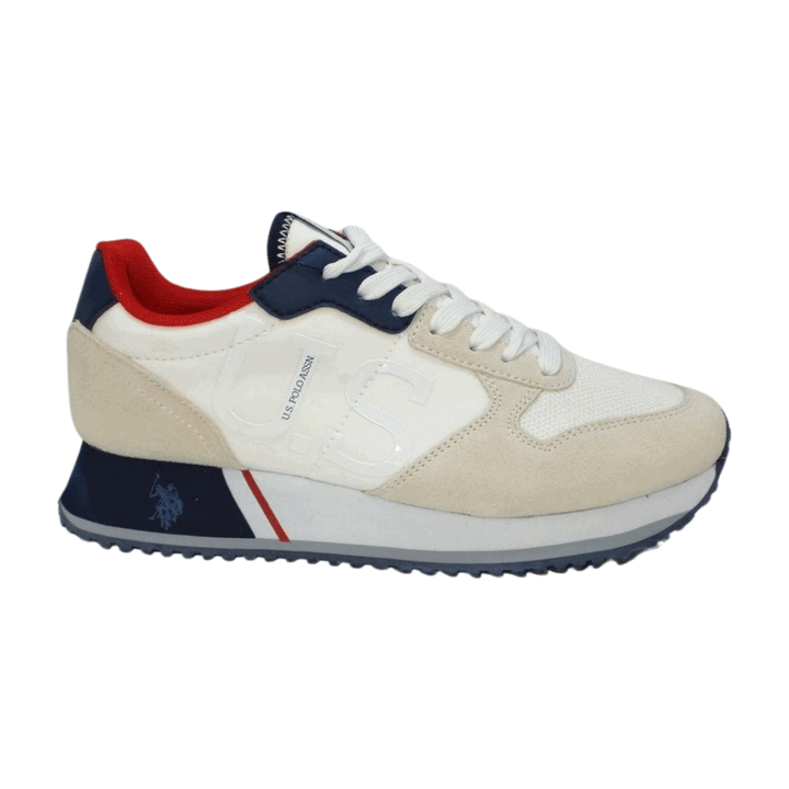Sneakers uomo U.S. Polo Assn. in tessuto tecnico e mesh bianco, camoscio beige con inserti in ecopelle blu. Talloniera rinforzata, linguetta logata e logo laterale. Chiusura con lacci piatti in cotone in tinta, sottopiede in memory foam. Fondo gomma logata bicolor altezza 3.5 cm