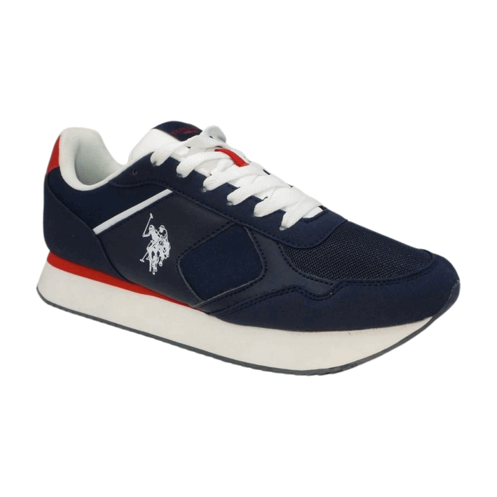 Sneakers uomo U.S. Polo Assn. in tessuto tecnico blu navy con inserti in camoscio, mesh e ecopelle in tinta, e dettagli rossi e bianchi. Talloniera rinforzata, linguetta logata e maxi logo laterale a contrasto. Chiusura con lacci piatti in cotone, fondo gomma altezza 3 cm.