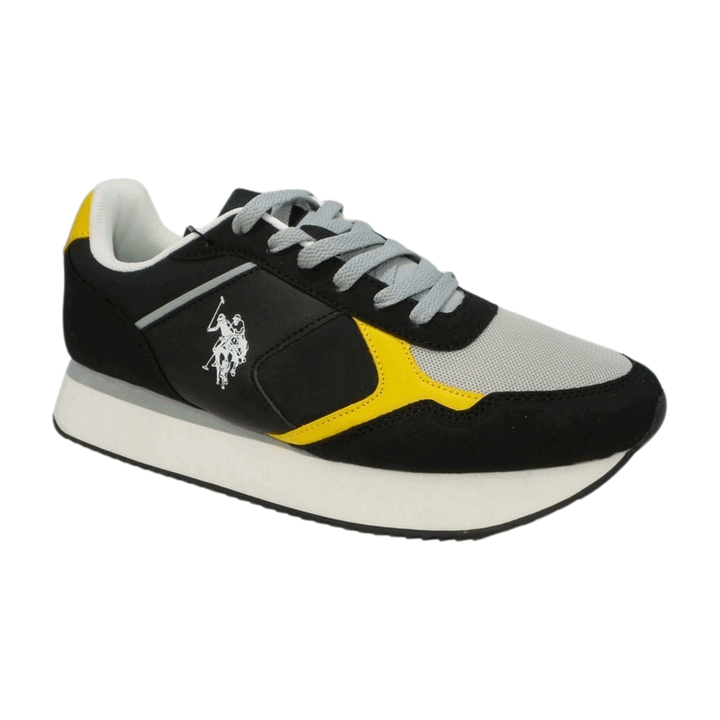Sneakers uomo U.S. Polo Assn. in tessuto tecnico nero con inserti in camoscio e ecopelle in tinta, mesh grigio e dettagli gialli. Talloniera rinforzata, linguetta logata e maxi logo laterale a contrasto. Chiusura con lacci piatti in cotone, fondo gomma altezza 3 cm.