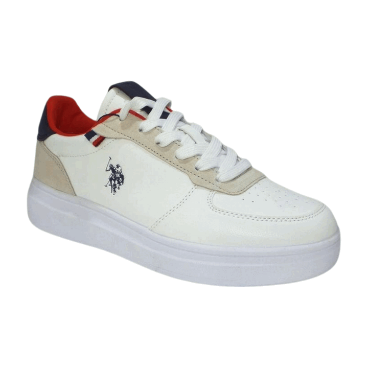 Sneakers uomo U.S. Polo Assn. in ecopelle bianca con punta laserata e inserti in camoscio beige. Dettagli multicolor rossi e blu, logo stampato sul laterale. Linguetta e talloniera logate, chiusura con lacci piatti in cotone in tinta. Fondo gomma bold altezza 4 cm.