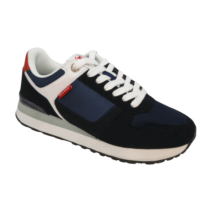 Sneakers uomo Valleverde in camoscio, tessuto e mesh blu navy con inserti in pelle bianca e rossa. Linguetta logata a contrasto, plantare removibile in memory foam. Chiusura con lacci piatti in cotone, spoiler posteriore logato in tinta. Fondo gomma altezza 4 cm.