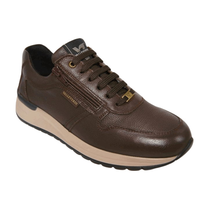 Sneakers uomo Valleverde in pelle marrone. Chiusura con lacci in cotone in tinta e zip sul laterale esterno. Linguetta logata, sottopiede in pelle comfort foam. Fondo antiscivolo in gomma altezza 4.5 cm
