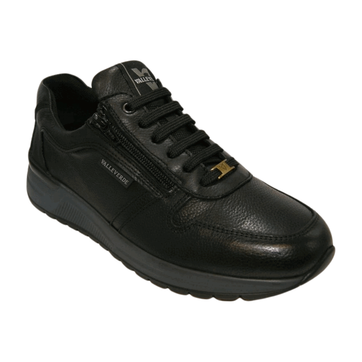 Sneakers uomo Valleverde in pelle nera. Chiusura con lacci in cotone in tinta e zip sul laterale esterno. Linguetta logata, sottopiede in pelle comfort foam. Fondo antiscivolo in gomma altezza 4.5 cm